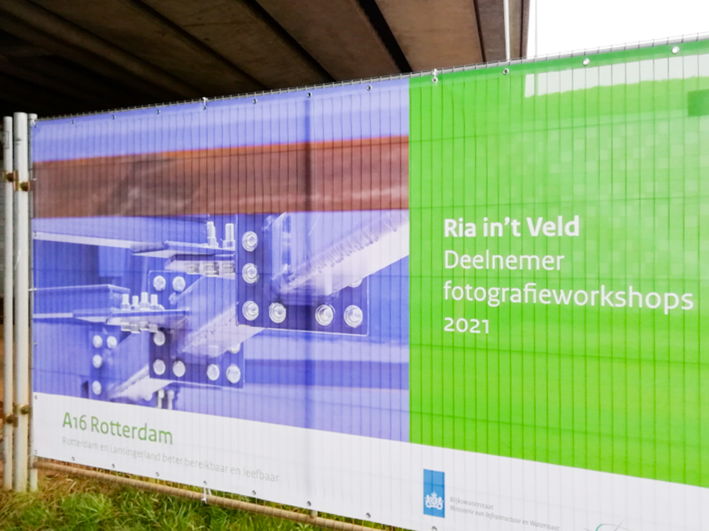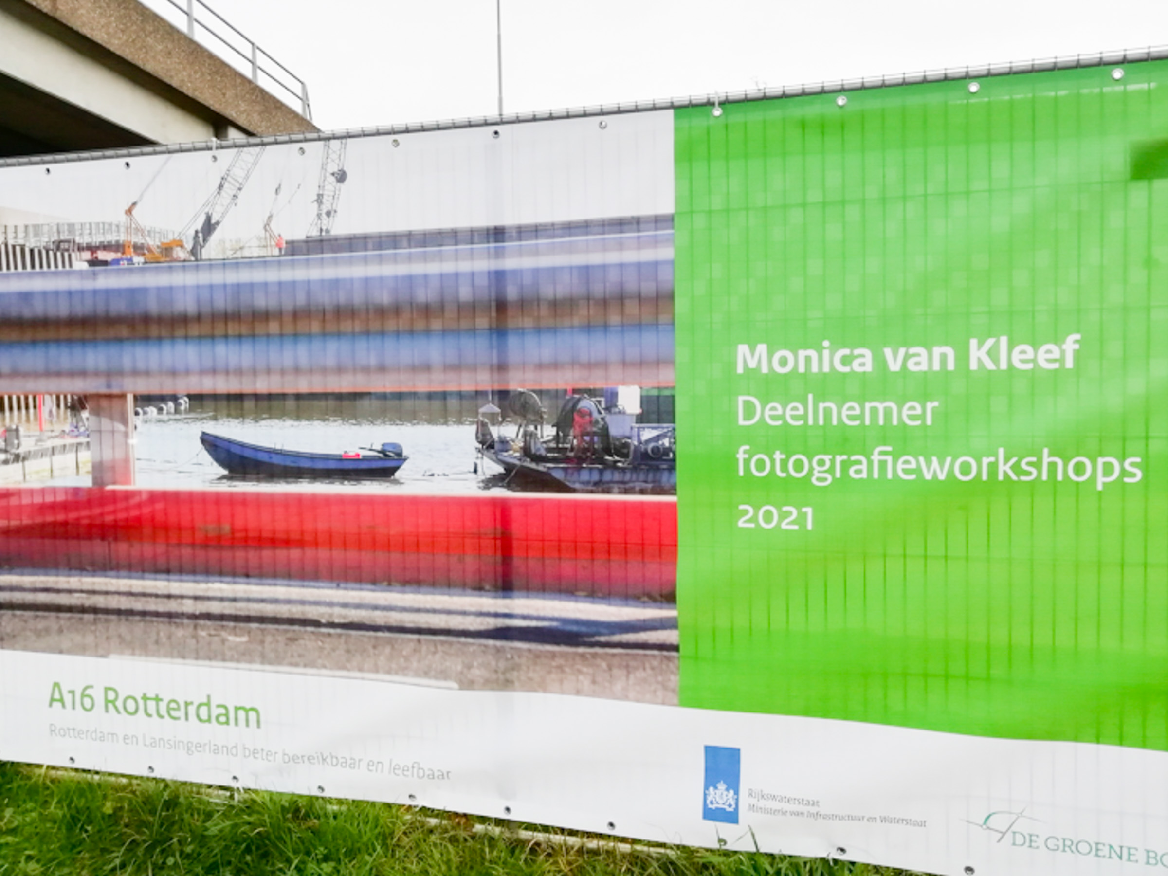Ria en Monica fotograferen al zo'n 4 jaar voor Rijkswaterstaat het project A16. Sinds deze week hangen er doeken rond het bouwterrein met een foto van Ria en van Monica bij het Terbregseplein